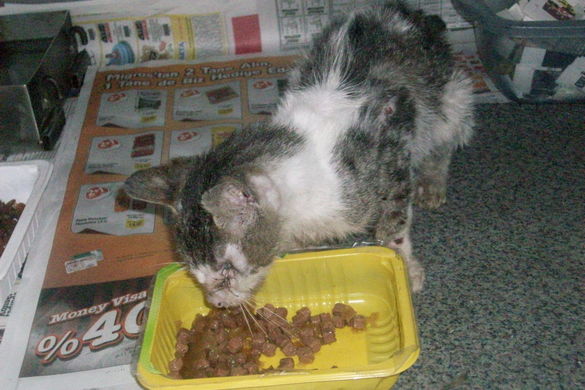Erkek bir sokak kedisi ve gene bir trafik kazası kurbanı idi. Bir üyemiz tarafından, birlikte çalıştığımız veteriner kliniğine ulaştırıldığında onu kurtaramayacağımıza inanmıştık; bir gözü dışarıya fırlamıştı, çenesi, yüzü kırklar içinde paramparçaydı ve bir kolu da kırılmıştı.